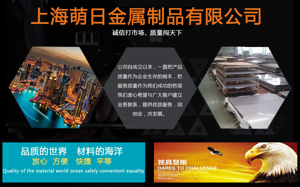 上海萌日金屬制品有限公司一直致力于為國內各大中型國有企業,外資企業,民營獨資企業,模具制造企業,機械加工企業,石油化工企業及器械企業等供應各種特種鋼材,進口/國產鋁合金,不銹鋼,合金結構鋼,42CrMo鋼板,35CrMo鋼板,40Cr鋼板,合金圓鋼,中厚板,鍛件,法蘭,鋼帶,軸承鋼,易切鋼,不銹圓鋼,合金管,矩形鋁管,無縫鋁管,鋁管,工業鋁管進口及國產方胚/鋼錠/鋁錠,應用于機械,機電,造船,工程,煤礦,紡織,電力,鍋爐, 汽車工業等各個領域。我公司可以根據客戶對特殊材料的要求進行材料和產品的定制,可按ISO,ANSI,JIS,DIN,GB等標準定制,我們將本著"誠實守信,合作共贏,長期合作"的理念與新老客戶一起進步發(fā)展。